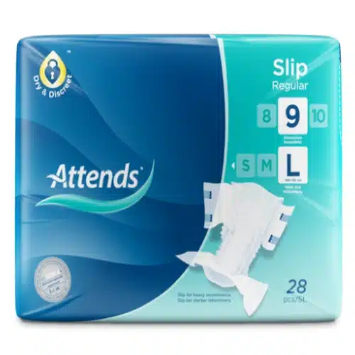 חיתול Attends Slip Regular 9 מיועד לספיגה גבוהה מאוד עד 2.5 ליטר. החיתול יושב באופן מושלם על הגוף ומונע דליפות.