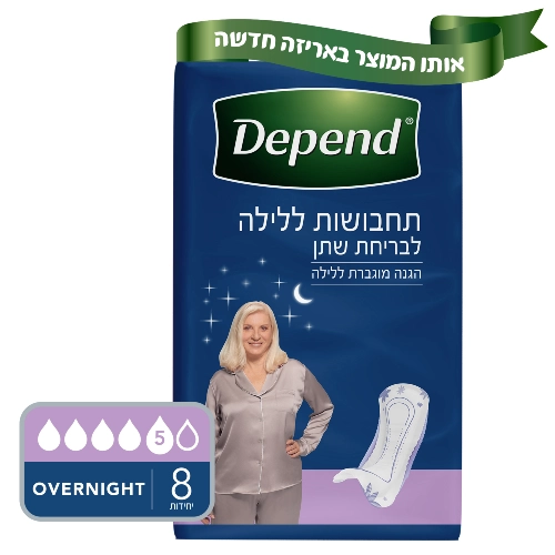 Depend (דיפנד) הוא מותג עולמי מוביל בתחום פתרונות הספיגה למבוגרים, המתמחה בתחתונים סופגים לבריחת שתן ופדים עם ספיגה גבוהה. המוצרים של דיפנד מציעים פתרון נוח, דיסקרטי ויעיל, עם טכנולוגיה מתקדמת המבטיחה תחושת יובש לאורך זמן והגנה מרבית. התחתונים הסופגים ופדים אלו מספקים נוחות מקסימלית ושמירה על העור, תוך מתן ביטחון ושקט נפשי לאורך כל היום.